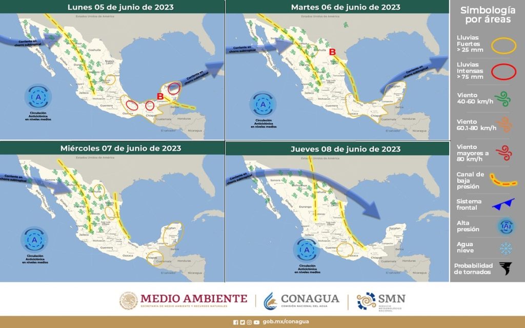 CUERNAVACA, Mor., 5 de junio de 2023.- La Comisión Estatal del Agua (Ceagua), a cargo de Jaime Juárez López, emite la perspectiva meteorológica referente a las condiciones que prevalecerán durante el periodo del 05 al 08 de junio, en los que se prevén nublados, posibilidad de lluvia y hasta granizo en algunos municipios de la entidad.