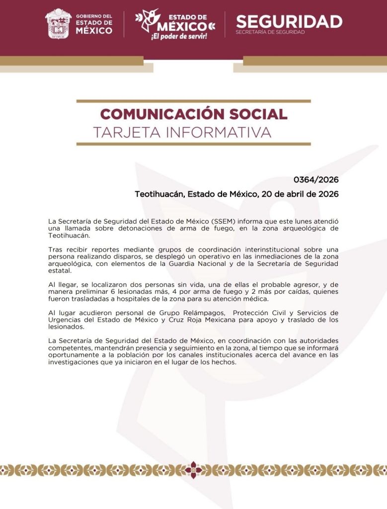 TEOTIHUACÁN, Edomex., 20 de abril de 2026.- El Gabinete de Seguridad de México confirmó la muerte de una mujer de nacionalidad canadiense tras el tiroteo registrado este lunes en la Pirámide de la Luna, en Teotihuacán, Estado de México (EMX).