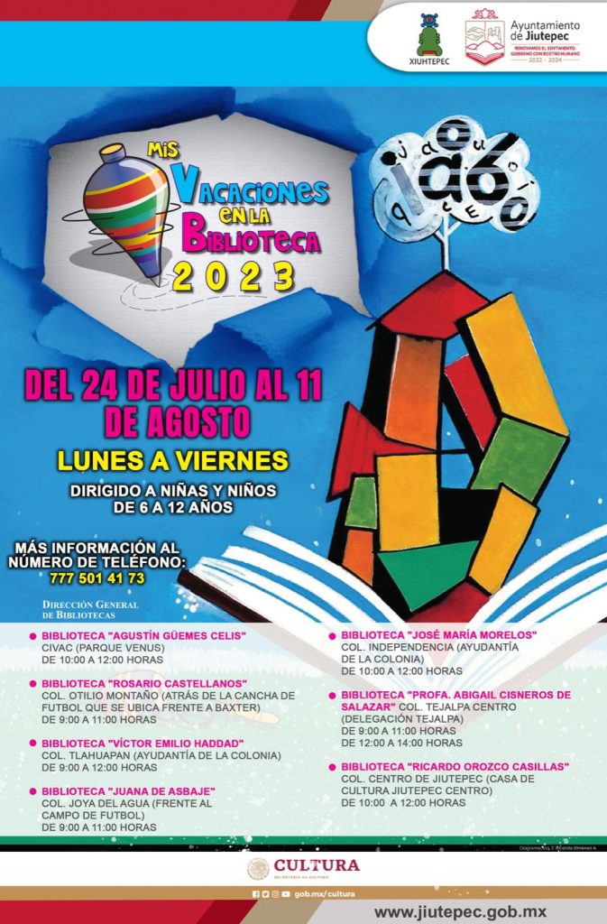 JIUTEPEC, Mor., 5 de julio de 2023.- Para ofrecer una alternativa de esparcimiento para niñas y para niños durante sus vacaciones de verano, el alcalde Rafael Reyes invita a la niñez del municipio de Jiutepec a participar en el curso Mis vacaciones en la biblioteca 2023 a desarrollarse entre el lunes 24 de julio y el viernes 11 de agosto del presente.