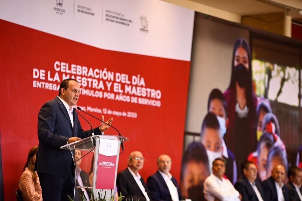 CUERNAVACA, Mor., 12 de mayo de 2023.- El gobernador Cuauhtémoc Blanco festejó el Día del Maestro, que se celebra cada 15 de mayo, junto a docentes de todo el territorio estatal, además, entregó estímulos y recompensas por años de servicio a mujeres y hombres que han dedicado su vida a la formación académica de niñas, niños y adolescentes.